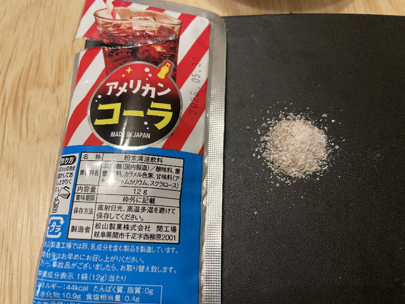同じく駄菓子コーナーにあった粉ジュース。今回はこちらも重曹と砂糖、酸味料で構成されているので成分的にはだいたいラムネ菓子と言ってよさそうだ。